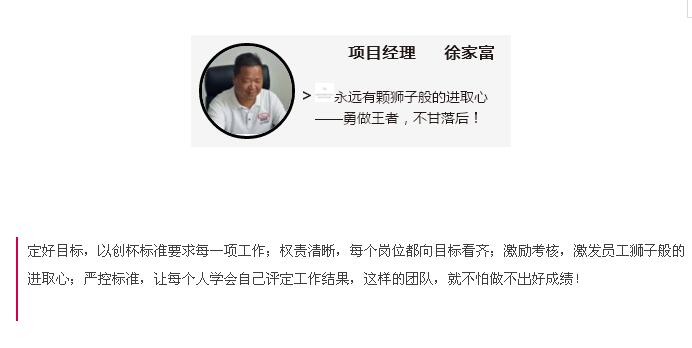 南湖小學項目是事關教育百年大計的重要民生工程,開工以來不僅受到各級政府領導的熱切關注,也受到集團領導的高度重視,自承接項目伊始,項目經(jīng)理徐家富就承諾:一定要把南湖小學項目做成集團的樣本工程,創(chuàng)杯工程,讓社會和政府滿意的工程!短短三個月的時間,南湖小學項目就取得了不少成就,不僅受到政府各級領導的表揚,也榮獲了集團各職能部門的一致好評,更讓他的承諾成功轉(zhuǎn)化為現(xiàn)實!