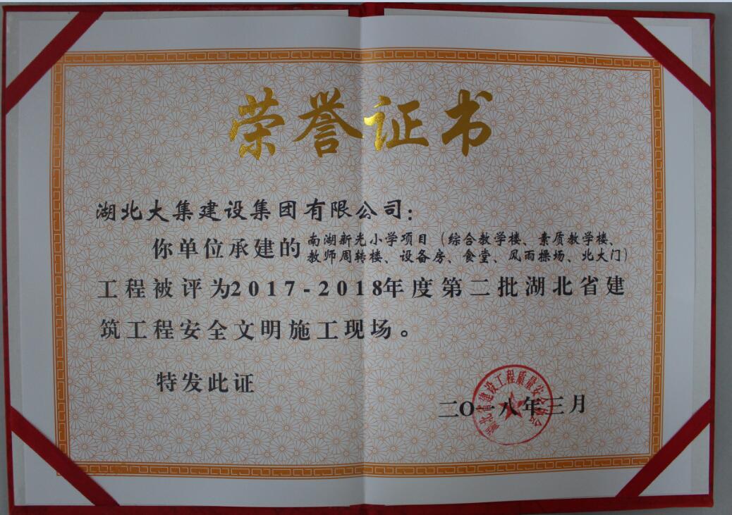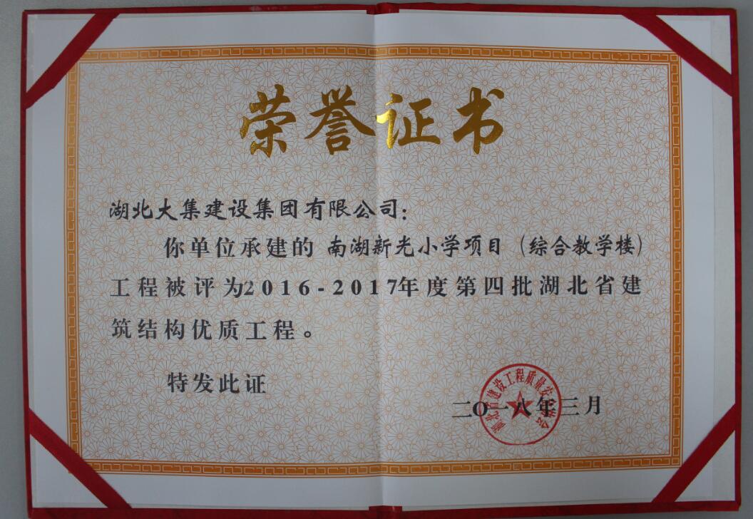 南湖新光小學(xué)項目(綜合教學(xué)樓、素質(zhì)教學(xué)樓、教師周轉(zhuǎn)樓、設(shè)備房、食堂、風(fēng)雨操場、北大門)工程被評為2017-2018年度第二批湖北省建筑安全文明施工現(xiàn)場(楚天杯);綜合教學(xué)樓工程被評為2016-2017年度第四批湖北省建筑結(jié)構(gòu)優(yōu)質(zhì)工程!