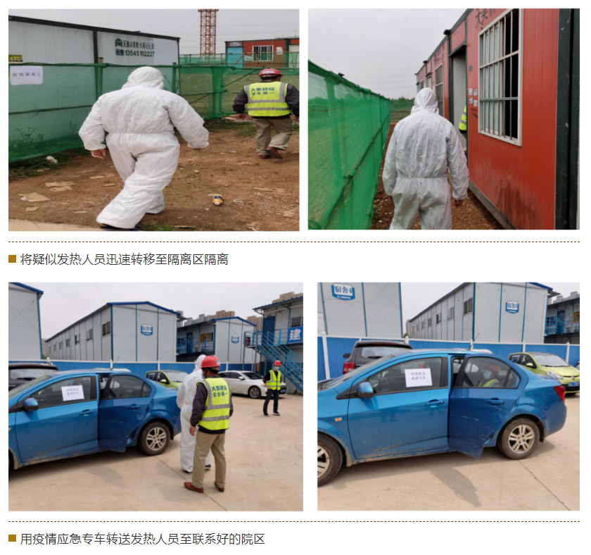 本次演練現(xiàn)場模擬一例疑似發(fā)熱患者,從被發(fā)現(xiàn)到應急處理的全過程。演練內(nèi)容包括情況上報、項目應急預案啟動、緊急隔離、送醫(yī)、現(xiàn)場消毒等環(huán)節(jié)。整個演練過程緊張有序、防疫物資標準齊全、保障到位,參加演練人員反應迅速、配合默契、職責明確,達到了預期效果。