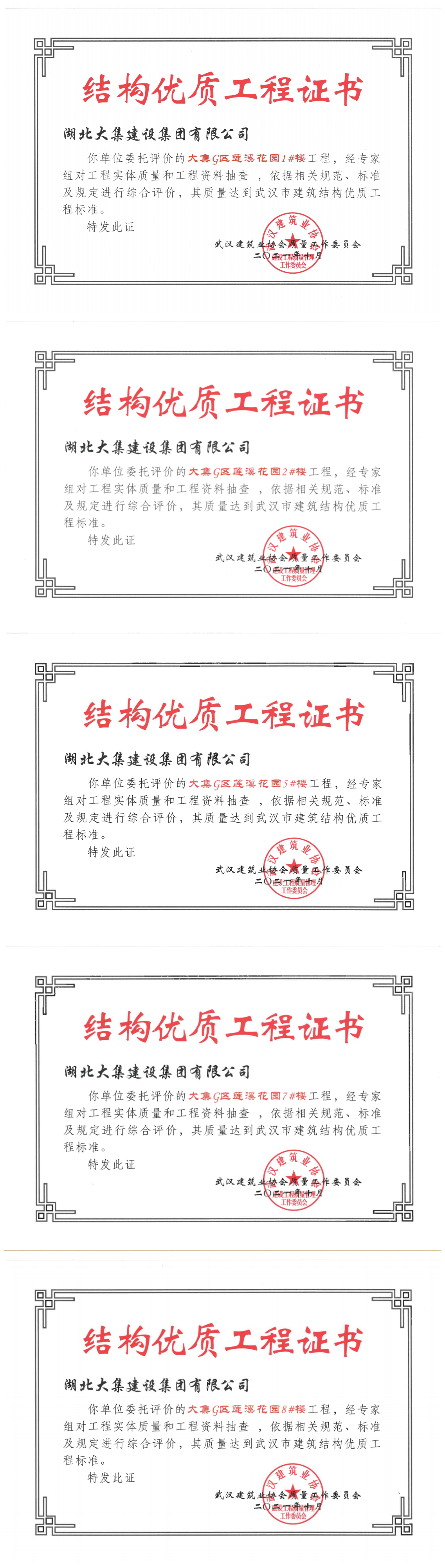 近日,由湖北大集建設(shè)集團承建的大集G區(qū)蓮溪花園項目1#、2#、5#、7#、8#樓榮獲“武漢市建筑結(jié)構(gòu)優(yōu)質(zhì)工程”榮譽。