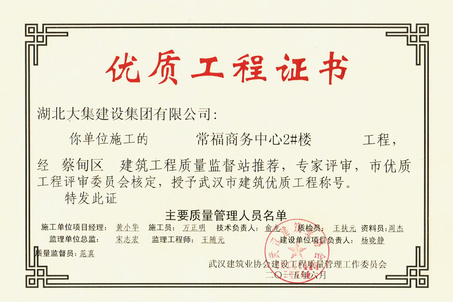 • 公司注資6100萬,更名為“湖北大集建設(shè)集團(tuán)有限公司”。同年,涉足房地產(chǎn)開發(fā),成立“湖北聚盛置業(yè)有限公司”。