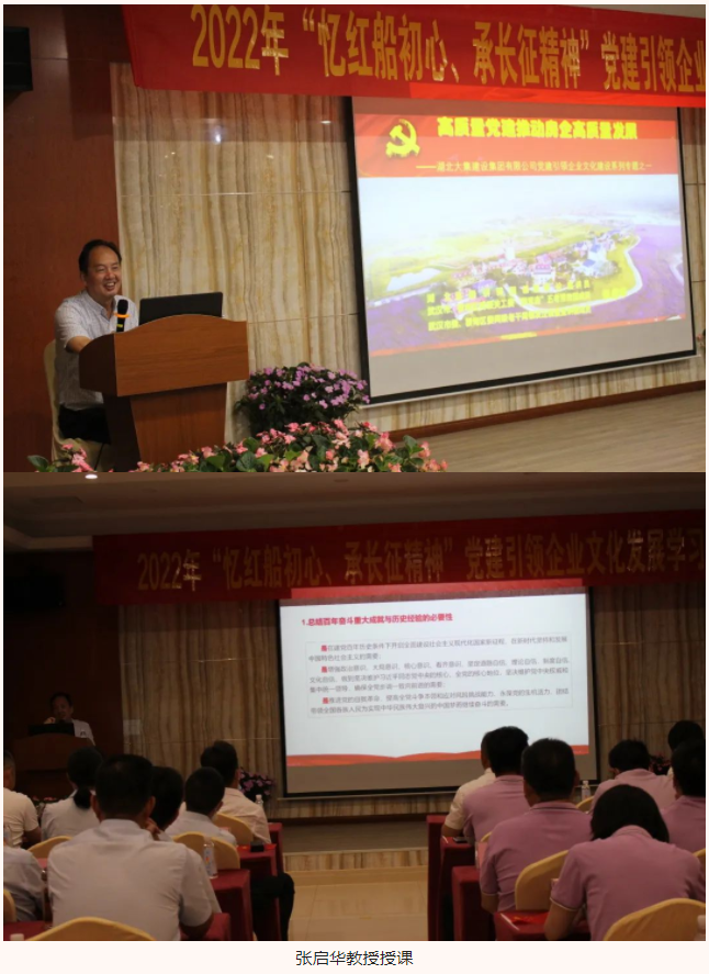接著,湖北省委講師團(tuán)基層理論宣講員張啟華教授以“高質(zhì)量黨建推動(dòng)企業(yè)高質(zhì)量發(fā)展”為主題進(jìn)行授課。張教授從“苦難與輝煌”、“消失與崛起”、“巨變與挑戰(zhàn)”、“經(jīng)驗(yàn)與啟示”、“輝煌與蝶變”五個(gè)方面分別講述了中國共產(chǎn)黨的百年奮斗史、跌宕起伏中國房企十年之變、房企掌舵者眼中的2022年、紐約灣區(qū)發(fā)展成為世界級灣區(qū)的原因以及高科技贏在新時(shí)代的內(nèi)容,并在講解中融入了湖北大集建設(shè)集團(tuán)和武漢閱景匯兩家公司的發(fā)展歷程,讓大家對中國共產(chǎn)黨的發(fā)展、公司的發(fā)展以及個(gè)人的發(fā)展有了更加清晰的認(rèn)識以及深刻的反思。