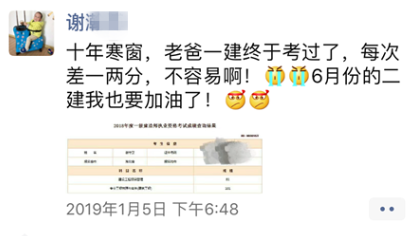 1月5日,2018年度一級建造師考試可以查成績了。管理81,實(shí)務(wù)101,謝守衛(wèi)在連續(xù)兩個(gè)考試年度內(nèi)通過了全部應(yīng)試科目,從2009年到2018年,他堅(jiān)持十年,終于拿下了一級建造師資格證!