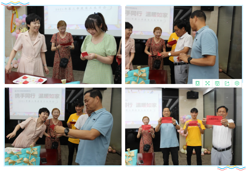 九月,秋高氣爽,碩果累累,秋日的微風(fēng)和陽光是如此的美好。成長不期而遇,生日如約而至。在精心布置的會議室里,輕快的音樂聲相隨,大屏幕上播放著美好的生日祝福,集團(tuán)公司為第三季度生日的員工舉辦了小小的生日Party。氣球、生日蛋糕、禮物、精致月餅、琳瑯滿目的零食飲品,每一處溫馨的細(xì)節(jié),都承載著公司對員工的愛與關(guān)懷。