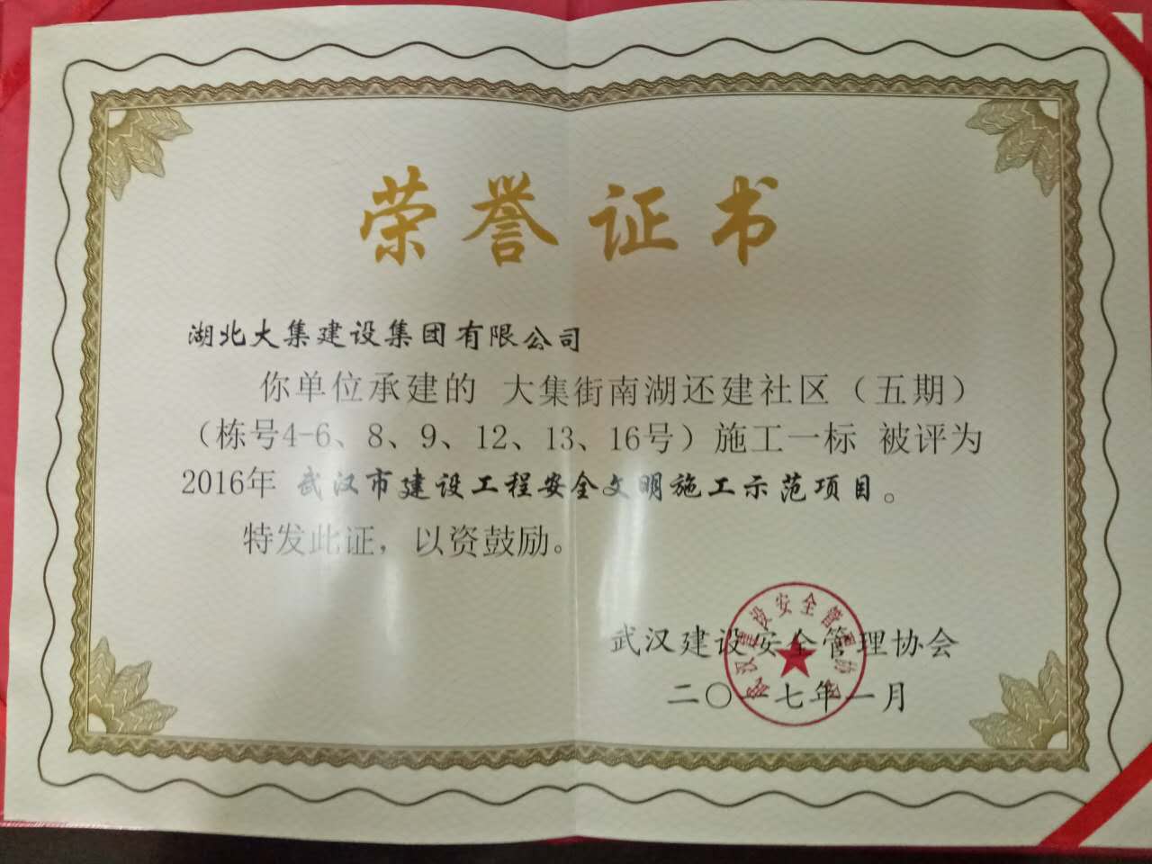 南湖五期項目繼4號樓、5號樓、6號樓,8號樓,9號樓、13號樓被上級監(jiān)管部門評定為“結(jié)構(gòu)優(yōu)質(zhì)“后,3月份項目部又獲得“湖北省優(yōu)秀建筑工地農(nóng)民工業(yè)余學校”榮譽稱號,4月12日,南湖五期4號樓、5號樓、8號樓、9號樓、12號樓、13號樓、16號樓再次被武漢建設(shè)安全管理協(xié)會評為"武漢市建筑工程安全文明施工示范項目",為湖北大集建設(shè)集團再贏回一座黃鶴杯!