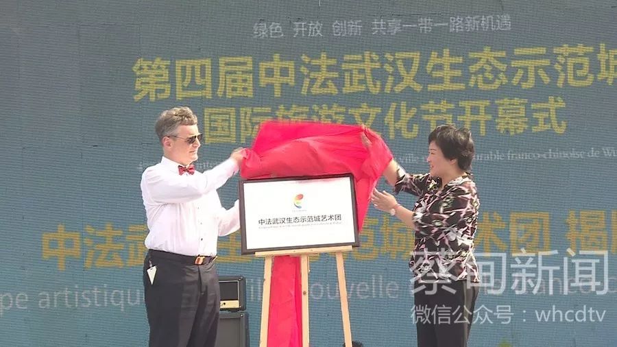 蔡甸區(qū)長、中法武漢生態(tài)示范城管委會第一副主任彭巧娣與法國駐漢總領事貴永華為“中法武漢生態(tài)示范城藝術團”揭牌。